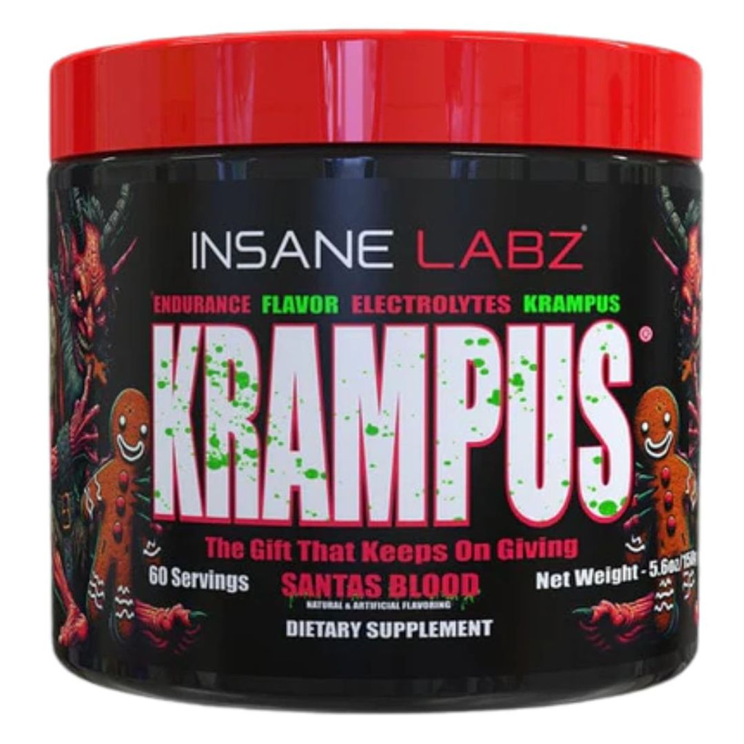 R: O Insane Labz Krampus é um repositor de eletrólitos em pó com 60 doses de 2,6g (1 scoop), sabor Santas Blood. Cada dose fornece: OxyGold® (Ácido Fúlvico patenteado) 50mg, Vitamina B12 20mcg (833% VD), Cloreto 197mg, Sódio 84mg, Potássio 78mg e Magnésio (Citrato) 28mg. Formulado pela Insane Labz para suporte à hidratação e resistência durante atividades físicas. Sem cafeína ou estimulantes. Peso líquido 156g (5,6oz).